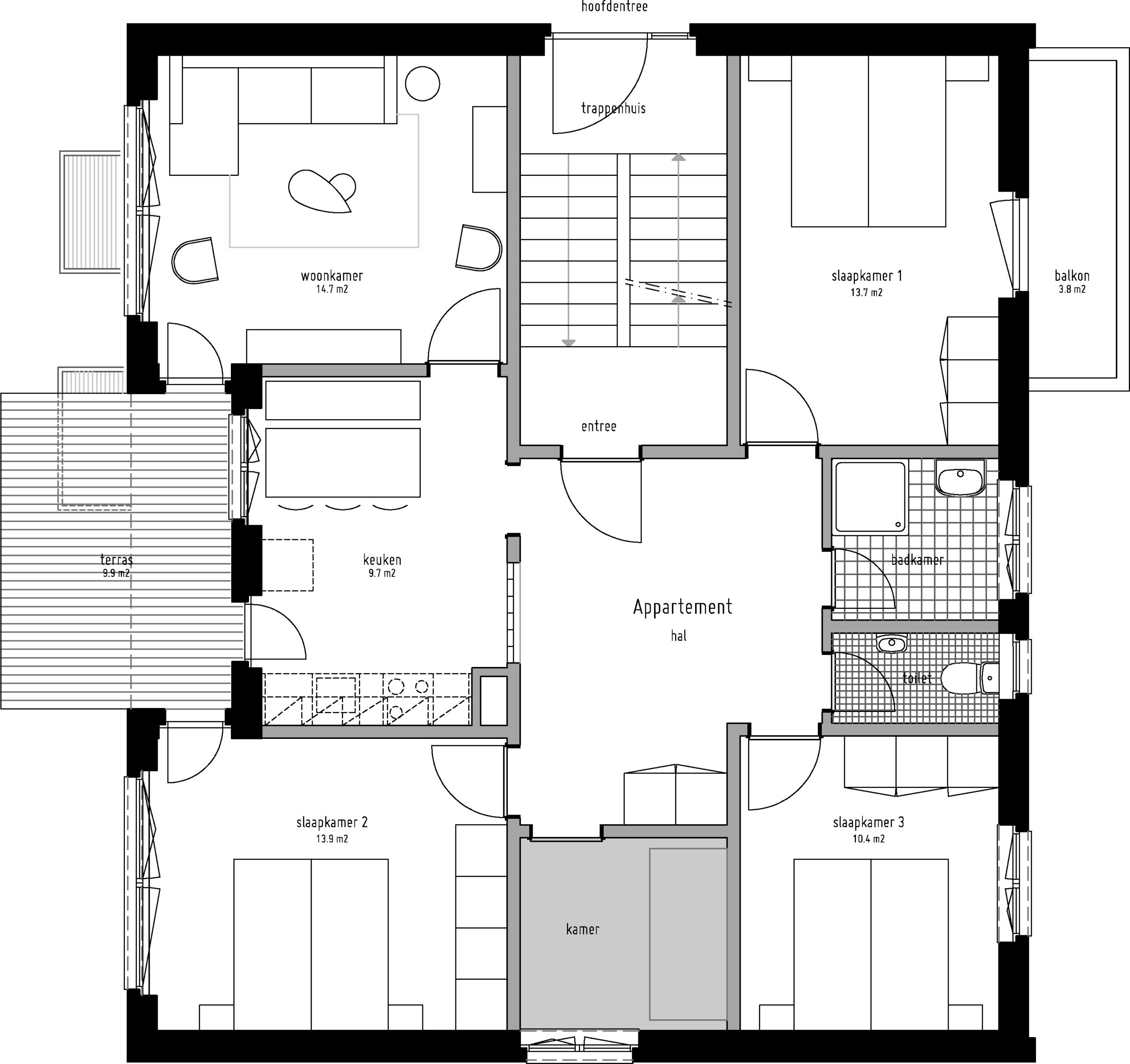 De drie slaapkamers hebben tweepersoonsbedden met éénpersoonsmatrassen. Ook is er